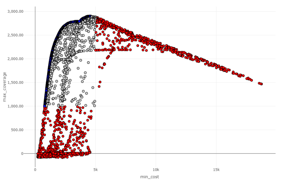 In diesem Beispiel könnten wir uns 300 direkte Simulationen im adaptiven Sampling-Modus leisten, und mit Hilfe des Metamodells könnten wir dann fast (ohne weitere Zeitdauer) sofort 5.000 Optionen ausführen, um die Pareto Efficient Frontier (Grenze) zu finden.
